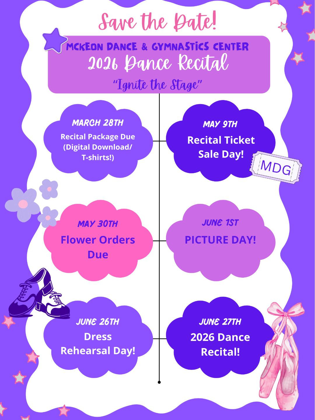All McKeon dance students will perform in one recital. Every dancer will participate in the show as well as the finale. Dress rehearsal will be held on Friday afternoon for a Saturday recital, or on Saturday morning for a Sunday show. Shows are typically held at 10:00am, 1:30 pm or 5:00 pm. Tickets will go on sale in May.